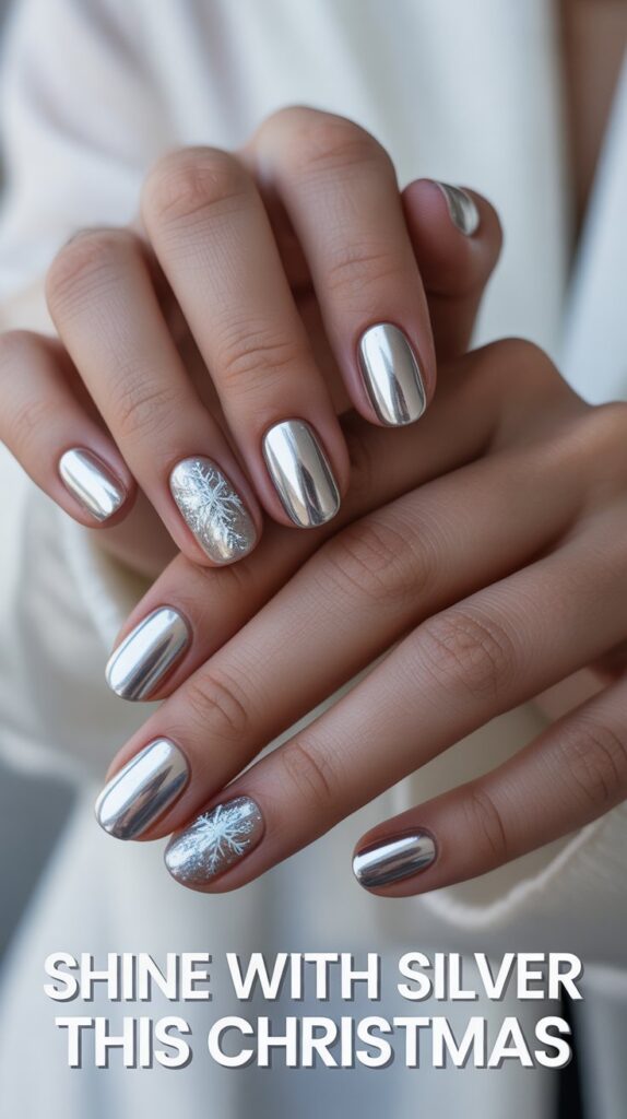 Translucent pink French manicure bases provide a soft, elegant foundation, while deep ruby chrome tips add a striking, high-fashion twist. The metallic finish reflects light beautifully, giving the nails a modern, editorial-quality look. A delicate white snowflake on an accent nail adds just enough festive detail to tie the design to the holiday season without overwhelming the sleek, contemporary style. This manicure is perfect for fashion-forward individuals who want a sophisticated yet festive look.