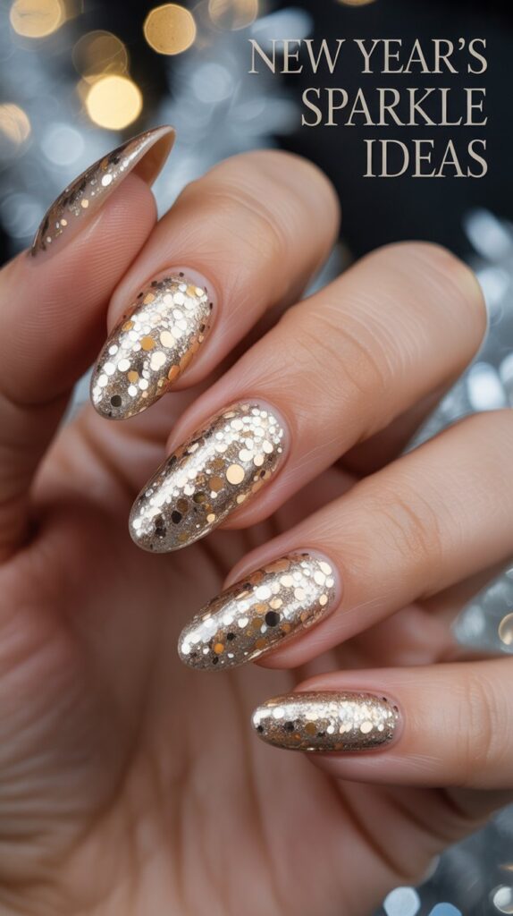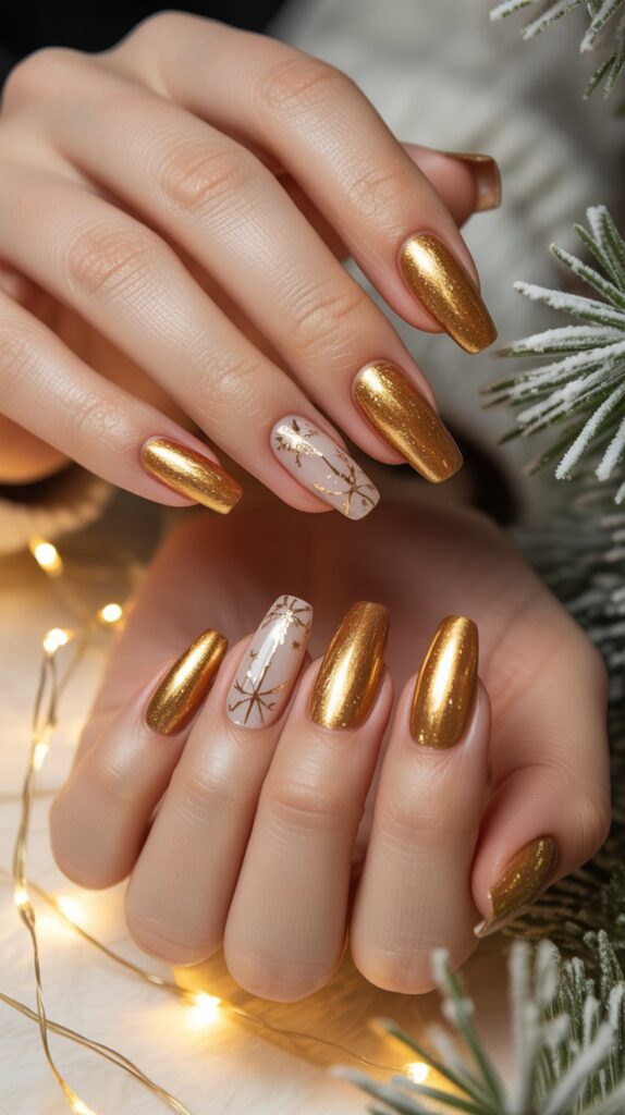 Glossy short red nails provide a vibrant, cheerful base that immediately feels festive. Pairing them with nude accent nails decorated with green leaves, red berries, and tiny golden sparkles adds a playful, seasonal twist inspired by mistletoe traditions. The combination balances bold holiday color with subtle detail, making the manicure perfect for parties or casual celebrations. It’s fun, charming, and captures the joyful spirit of Christmas without being overly complicated.