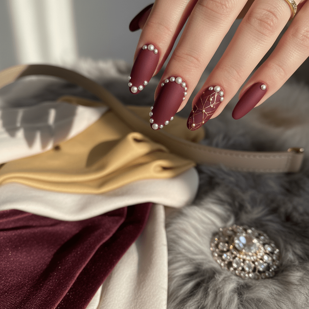 Dark velvet-red almond nails serve as a rich, luxurious canvas for swirling black marble patterns that add depth and drama. The glossy finish enhances the intricate marble effect, giving the nails a sophisticated, high-end look. This design is perfect for evening events, holiday parties, or any occasion where you want your manicure to feel bold, artistic, and elegant. It combines festive color with a touch of luxury, making a strong style statement.