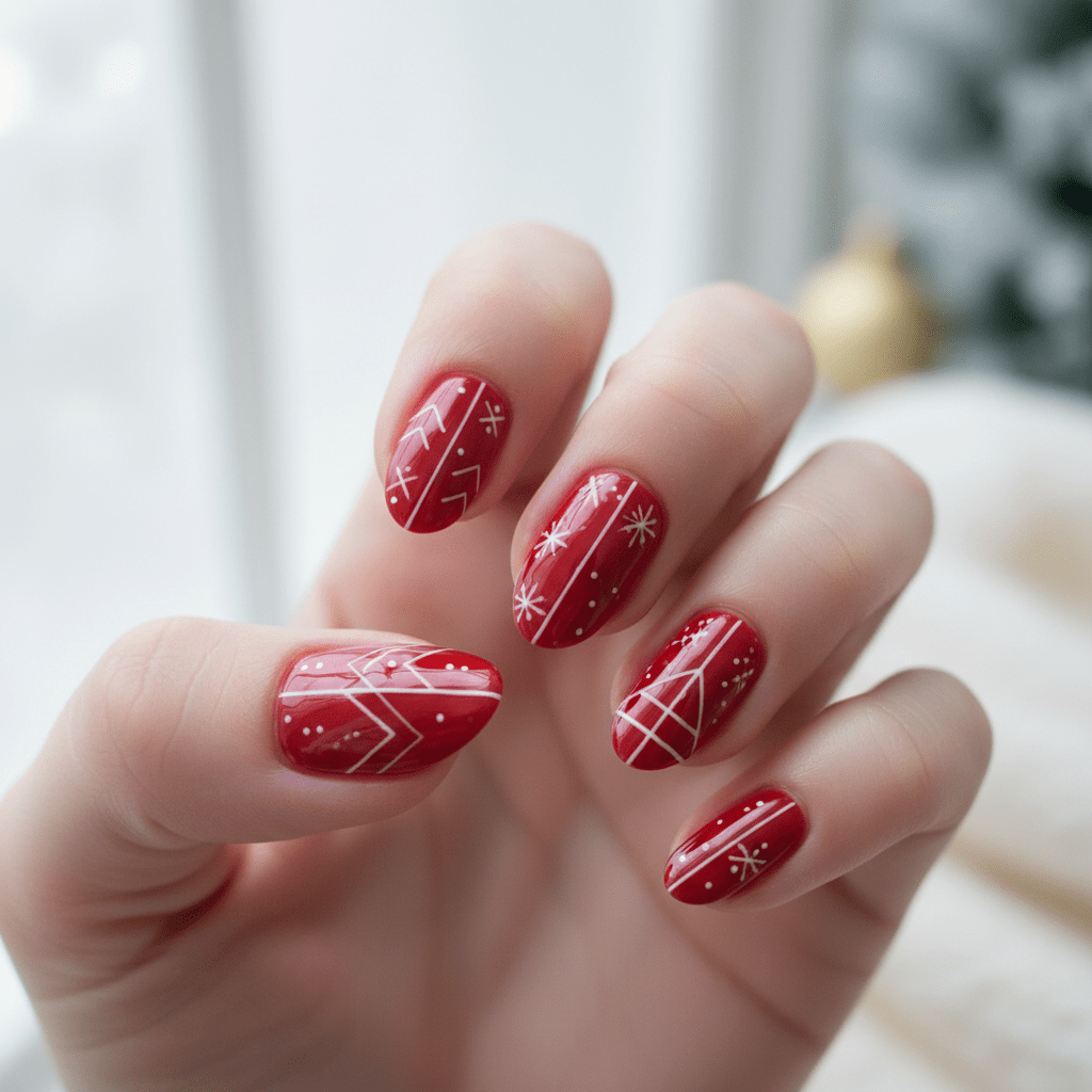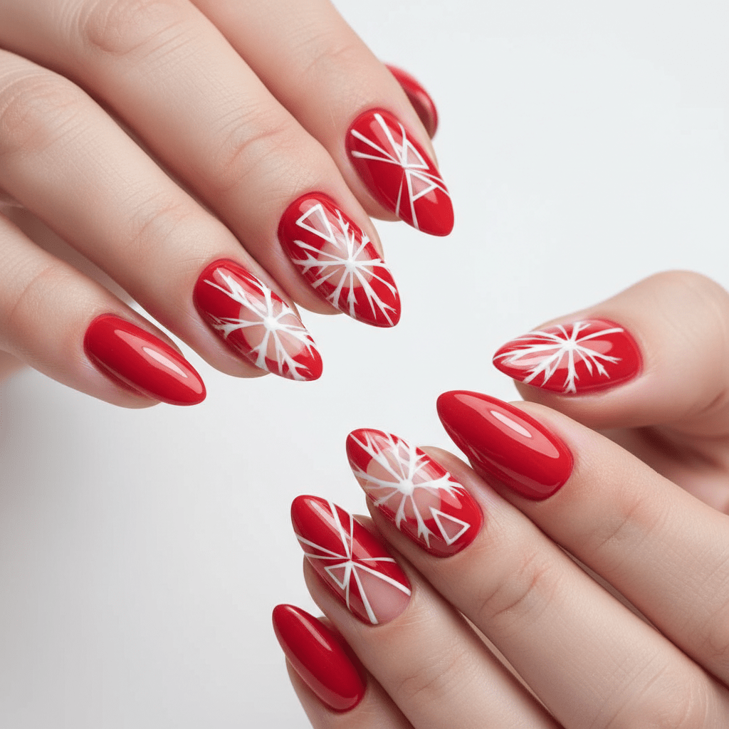 Bright red almond nails serve as a striking backdrop for graphic white snowburst designs that radiate energy and movement. The inclusion of negative-space details adds a modern, artistic twist, keeping the look fresh and fashion-forward. This manicure is bold and attention-grabbing while still feeling festive, perfect for anyone who wants a contemporary take on classic winter motifs. It’s ideal for parties, photos, or any occasion where your nails are meant to make a statement.