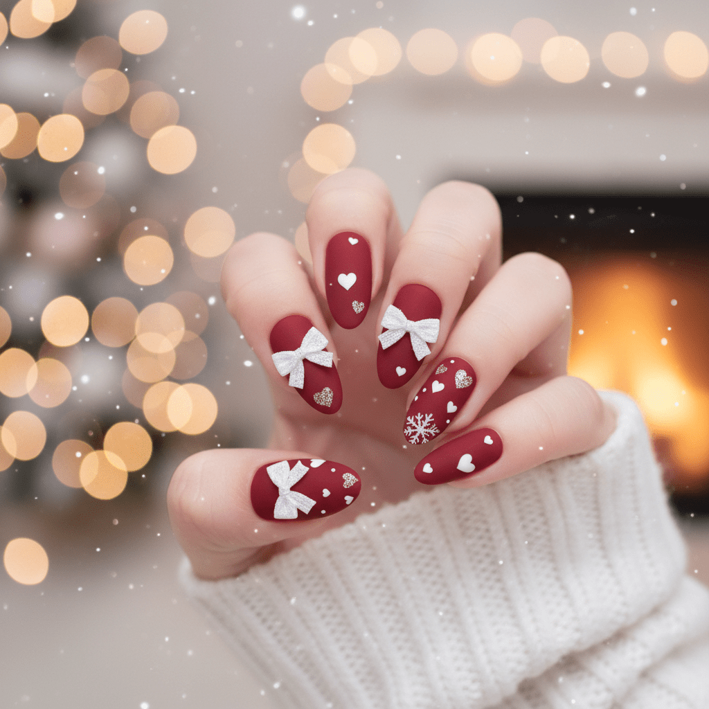Matte dark-red almond nails already have a soft, romantic feel, and the tiny white bows and hearts make the look even sweeter. The small snowflake details add a gentle winter touch that fits the season without taking away from the design’s elegance. The combination feels delicate, thoughtful, and perfect for moments when you want your nails to look charming and feminine. It’s a great choice for holiday dates, winter weddings, or any event where you want something romantic with a festive twist.