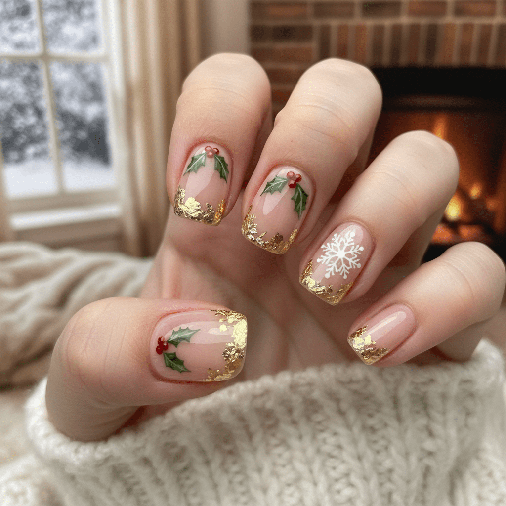 Rounded nude nails give this look a clean, understated base that makes the holly artwork stand out without feeling crowded. The hand-painted green leaves and red berries add a soft, festive touch that feels elegant rather than bold. A bit of gold foil near the cuticles brings in a warm glow that catches the light in a subtle way. Adding a tiny snowflake on one nail finishes the design with a hint of seasonal charm while keeping everything refined and balanced.