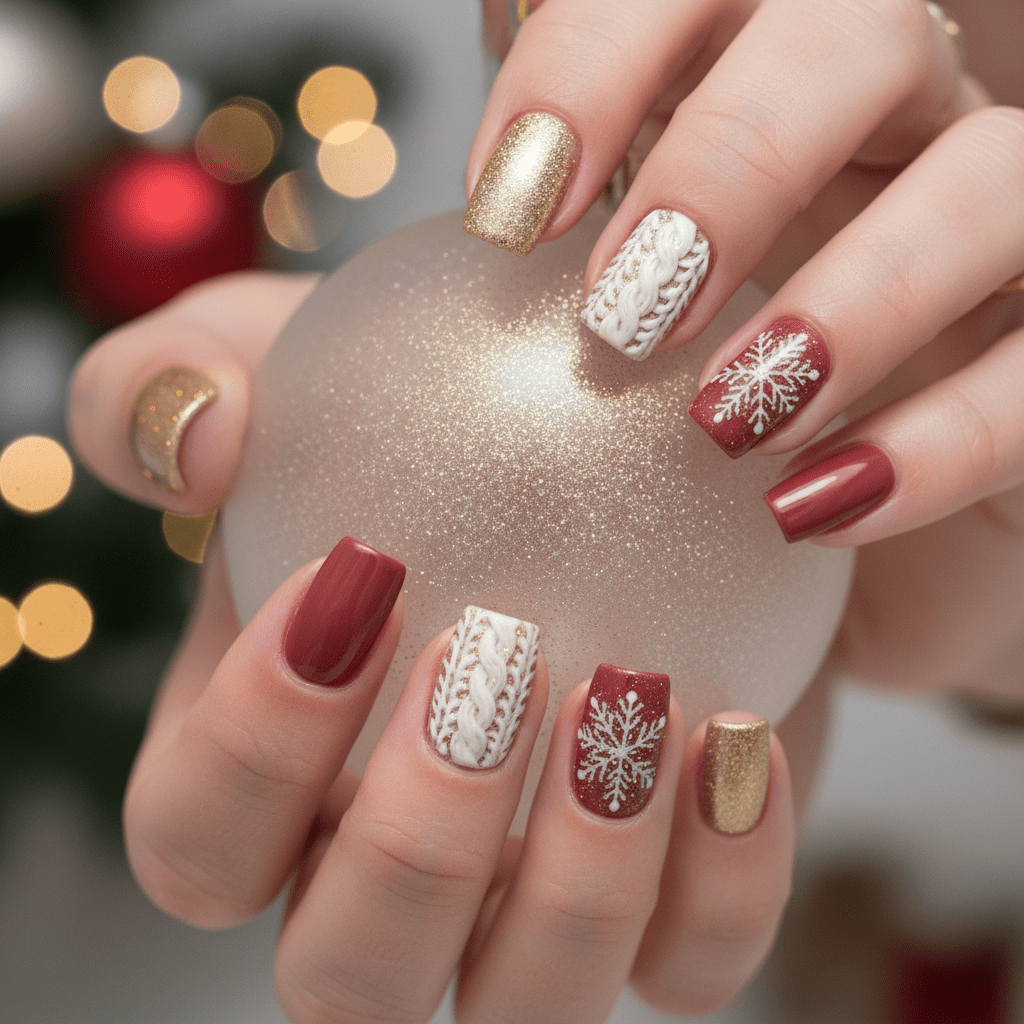 This design blends blush red, soft gold shimmer, and white textured accents to create a manicure that feels rich without being overdone. The gold adds a warm glow, while the white textured nails bring in a cozy, winter touch. Snowflakes and cable-knit patterns pull the colors together and add small details that make the look feel thoughtful and festive. It’s a great choice if you want a holiday style that looks elegant from every angle.