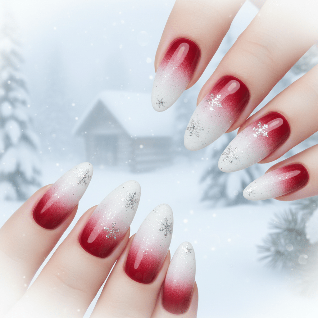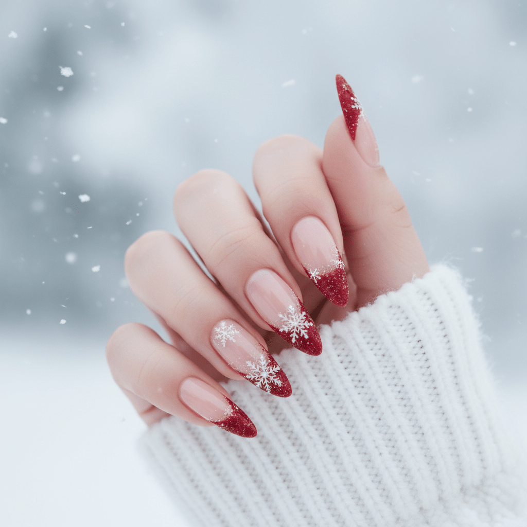 Long stiletto nails already make a strong statement, and the translucent nude base keeps that dramatic shape looking clean and balanced. The frosted red tips add a cool, wintry touch that feels fresh compared to the usual glossy French style. Light, detailed snowflakes placed near the tips bring in the holiday theme without overwhelming the design. It’s an edgy yet elegant look that works beautifully for parties, photos, and any moment when you want your nails to stand out.