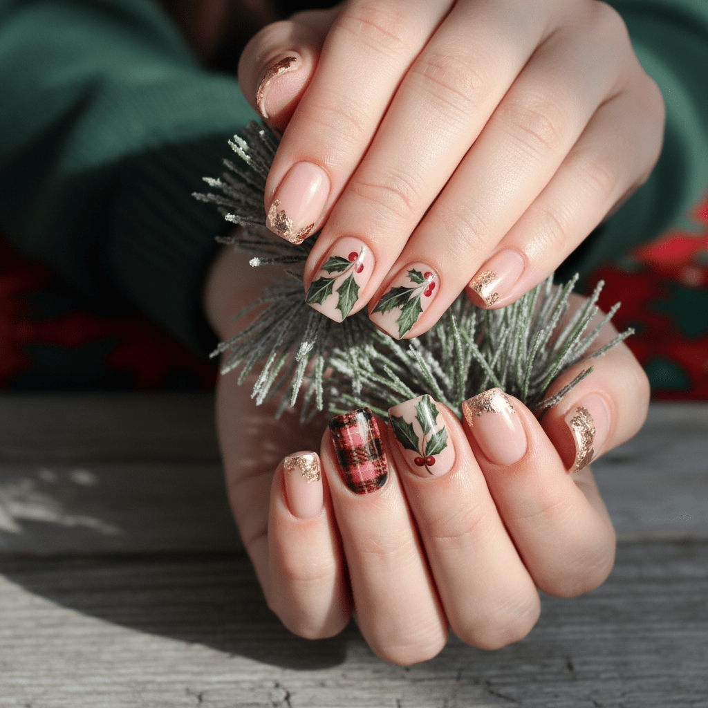 Medium-length nude nails create a clean, soft base that lets the holly artwork shine without feeling busy. The hand-painted green leaves and bright red berries add a natural, festive touch that feels inspired by classic holiday décor. Small touches of gold foil bring in a bit of warmth and sparkle, making the design feel more refined. Adding a red plaid accent nail ties the theme together and gives the whole look a polished, seasonally rich finish.
