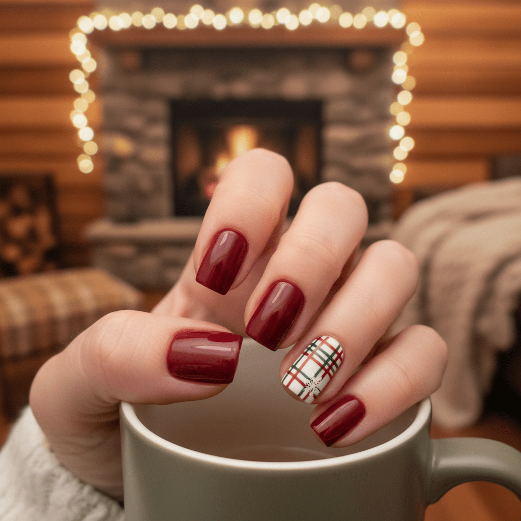 Short square red nails already have a neat, practical look, and adding a plaid accent instantly gives them that warm, cozy feeling you get from winter cabins and soft blankets. The white base on the accent nail makes the red-and-green plaid stand out clearly, giving the design a classic holiday touch. A small snowflake layered on top adds a bit of nostalgia, almost like a detail from an old-fashioned Christmas card. It’s a simple, comfortable style that still feels festive and full of character.