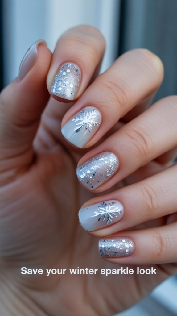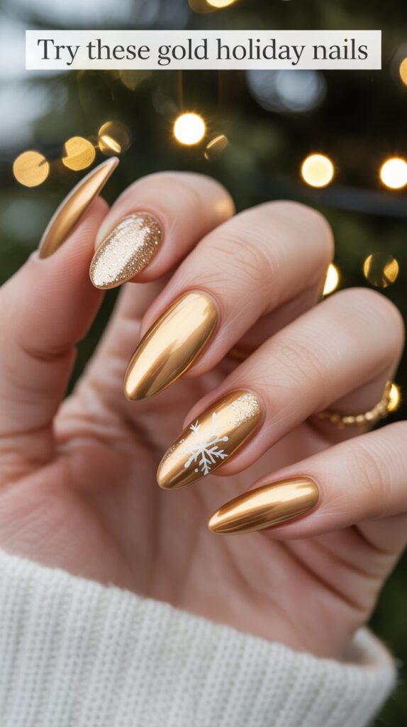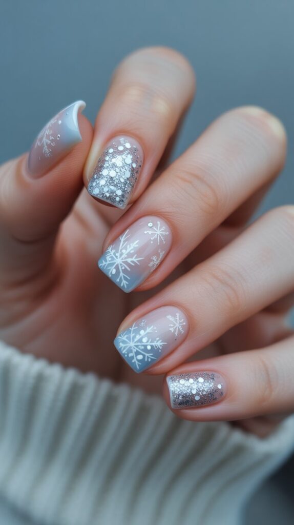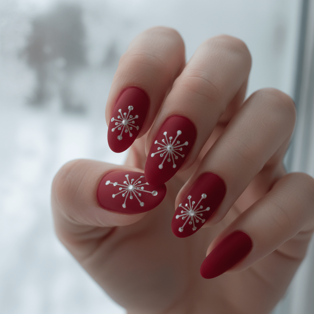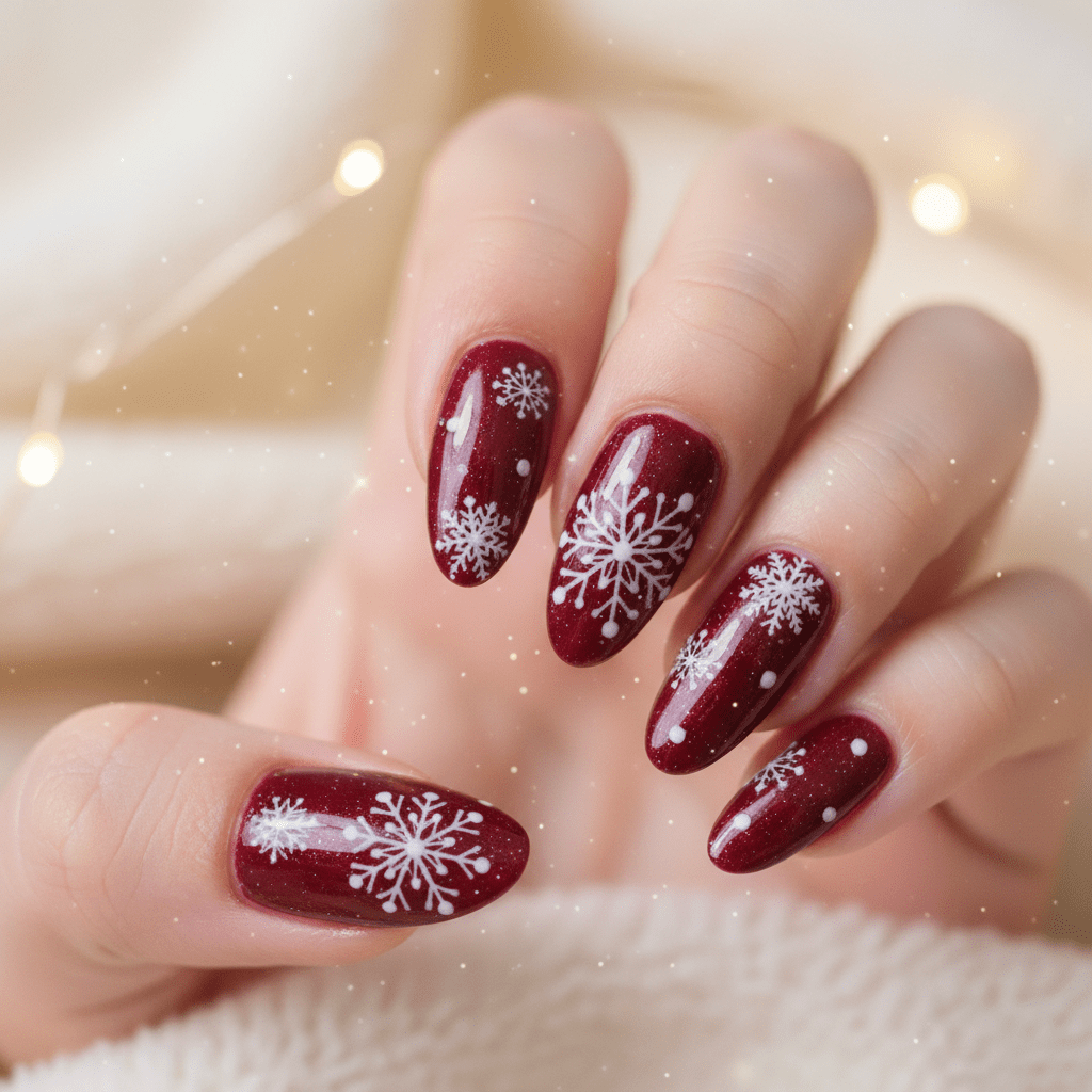 Dark crimson nails have a richness that instantly feels like winter, and they look even better on an almond shape. The deep red base creates a warm, luxurious backdrop for fine white snowflakes that stand out without overpowering the look. Adding a soft shimmer or micro-glitter gives the design a touch of movement, almost like fresh snow catching the light. It’s a style that works for any December moment, whether you’re heading to a cozy family gathering or dressing up for a formal holiday party.