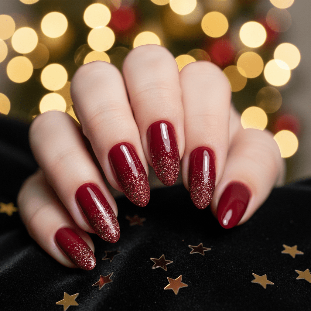 Deep cherry-red square nails provide a rich, elegant base that feels festive and sophisticated. Scattered gold glitter adds sparkle and dimension, evoking the celebratory shimmer of champagne bubbles. A single white snowflake on one accent nail grounds the design in the winter season, creating a perfect balance between glamour and holiday charm. This manicure is ideal for festive parties and New Year’s Eve celebrations, giving your nails a luxurious, joyful glow.