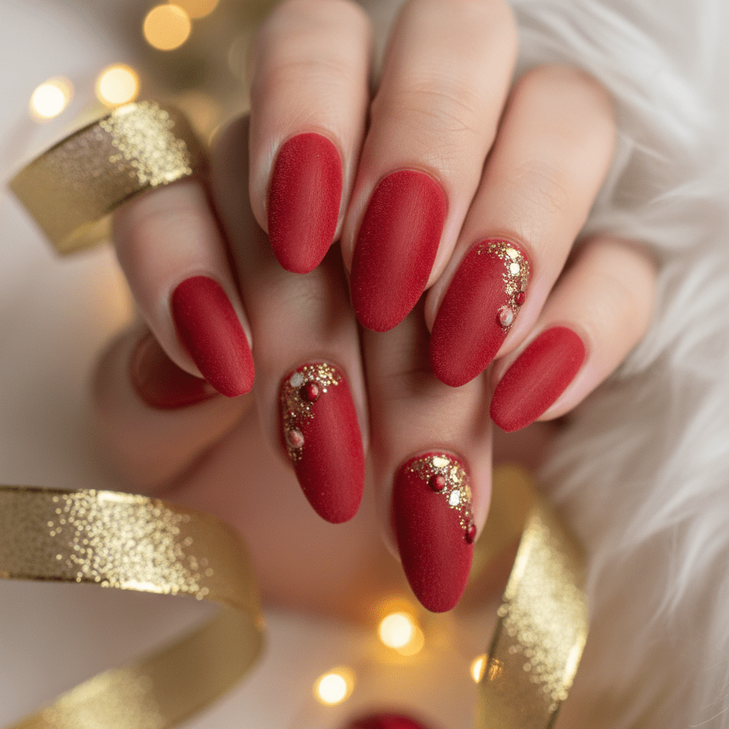 Scarlet matte nails feel bold the moment you see them, but the matte finish softens the look in a clean, modern way. The bright red base brings instant holiday energy, while the tiny snowflakes add just the right amount of playful detail. Placing a hint of glitter at the center of each snowflake gives the design a touch of sparkle without taking away from the velvety texture. It’s a simple, stylish choice for anyone who wants festive nails that still look polished and contemporary.