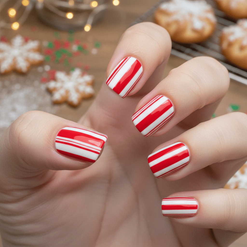 Candy-apple red nails paired with white accent nails featuring diagonal red stripes bring the iconic candy cane motif to life. A light glitter topcoat adds sparkle and movement, enhancing the festive, playful vibe. This cheerful design captures the joy and nostalgia of classic Christmas treats, making it perfect for holiday parties, family gatherings, or anyone looking to celebrate the season with fun, eye-catching nails.