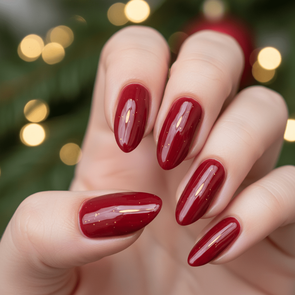 Glossy ruby red almond nails showcase the quintessential Christmas color in a simple yet elegant way. The rich, vibrant hue exudes warmth and festivity, while the almond shape elongates the fingers for a graceful, feminine look. This classic design celebrates traditional holiday colors with a polished, refined finish, making it a timeless choice suitable for any festive occasion or everyday winter style.